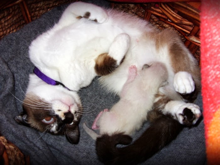 Para a proteger dos outros quatro gatos adultos, dois deles machos, um deles ainda não castrado e respectivo progenitor da cria, trouxe-a para o andar de cima e pus-lhe o cesto no meu quarto. A minha gata júnior tem aversão à solidão, tê-la perto funciona para ambas: eu controlo-a e protejo-a, ela tem companhia e uma dose extra de mimo.